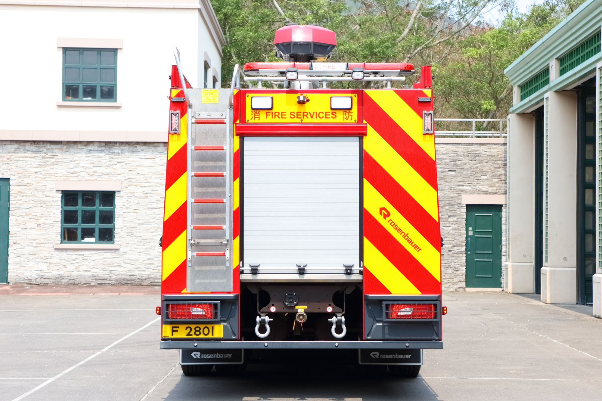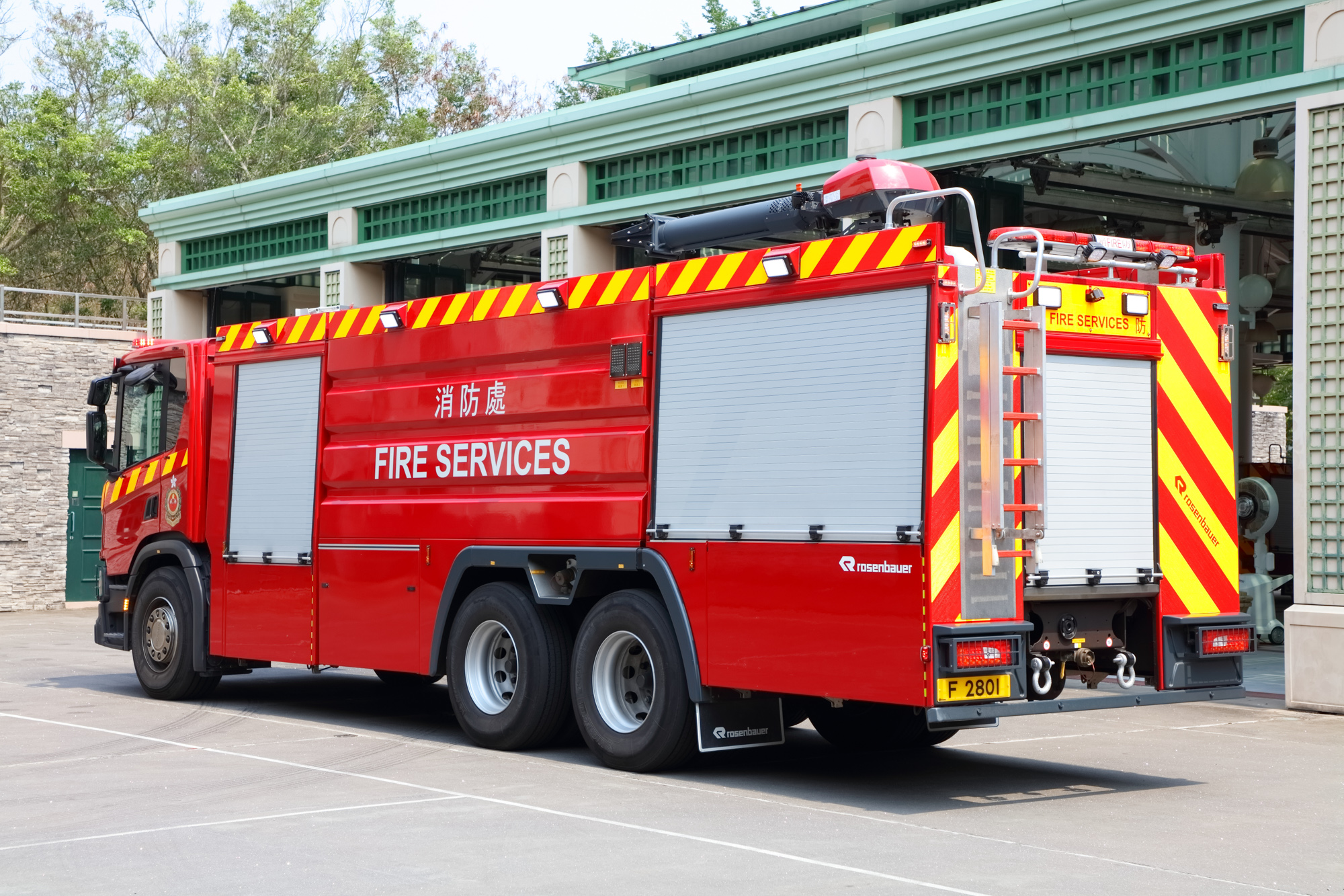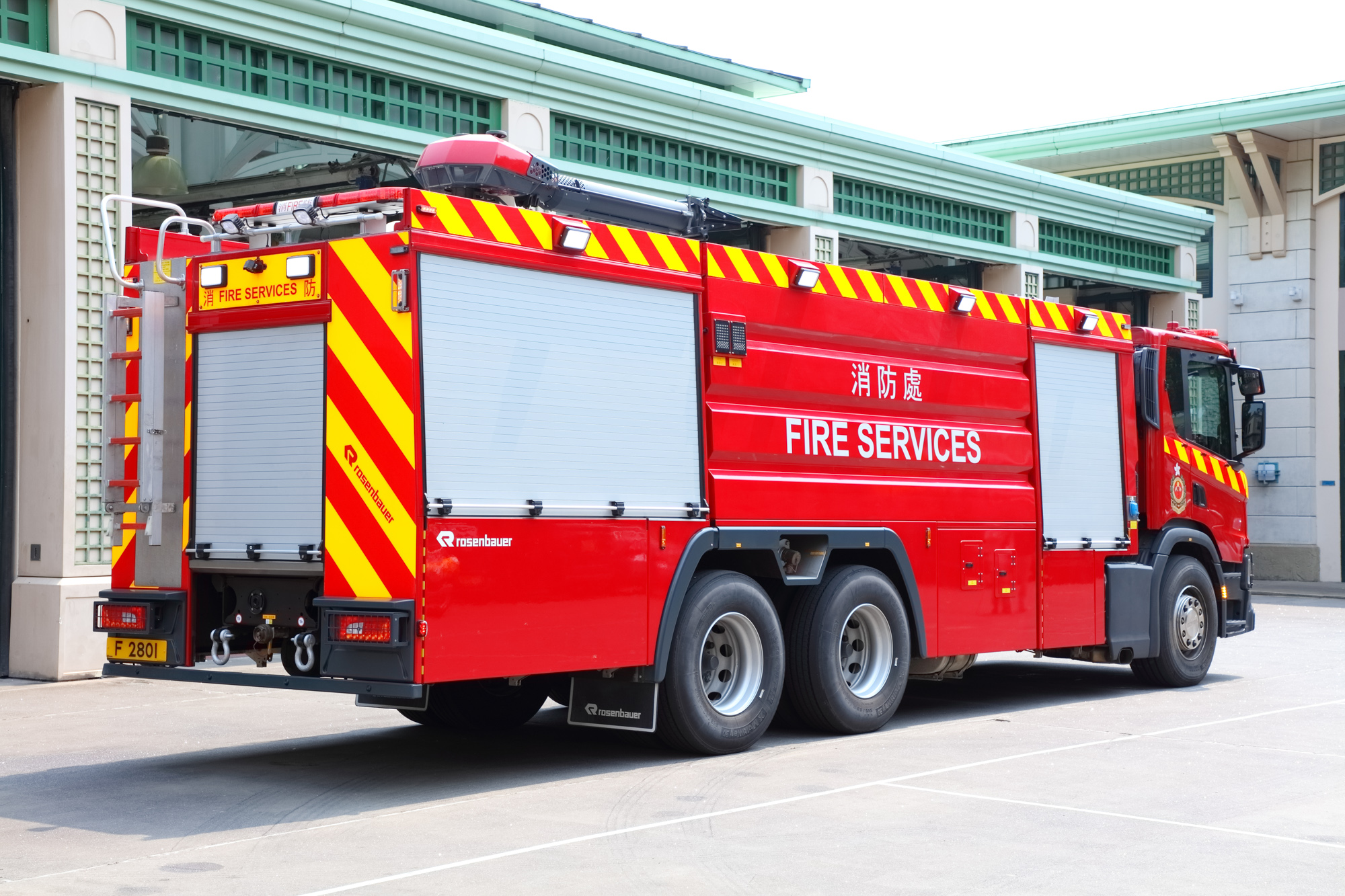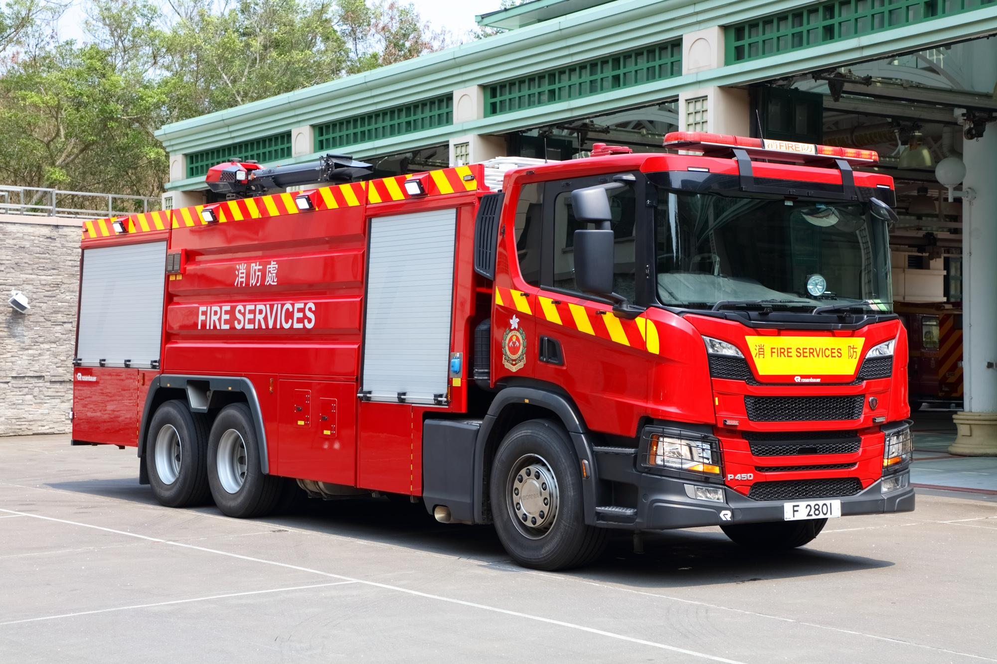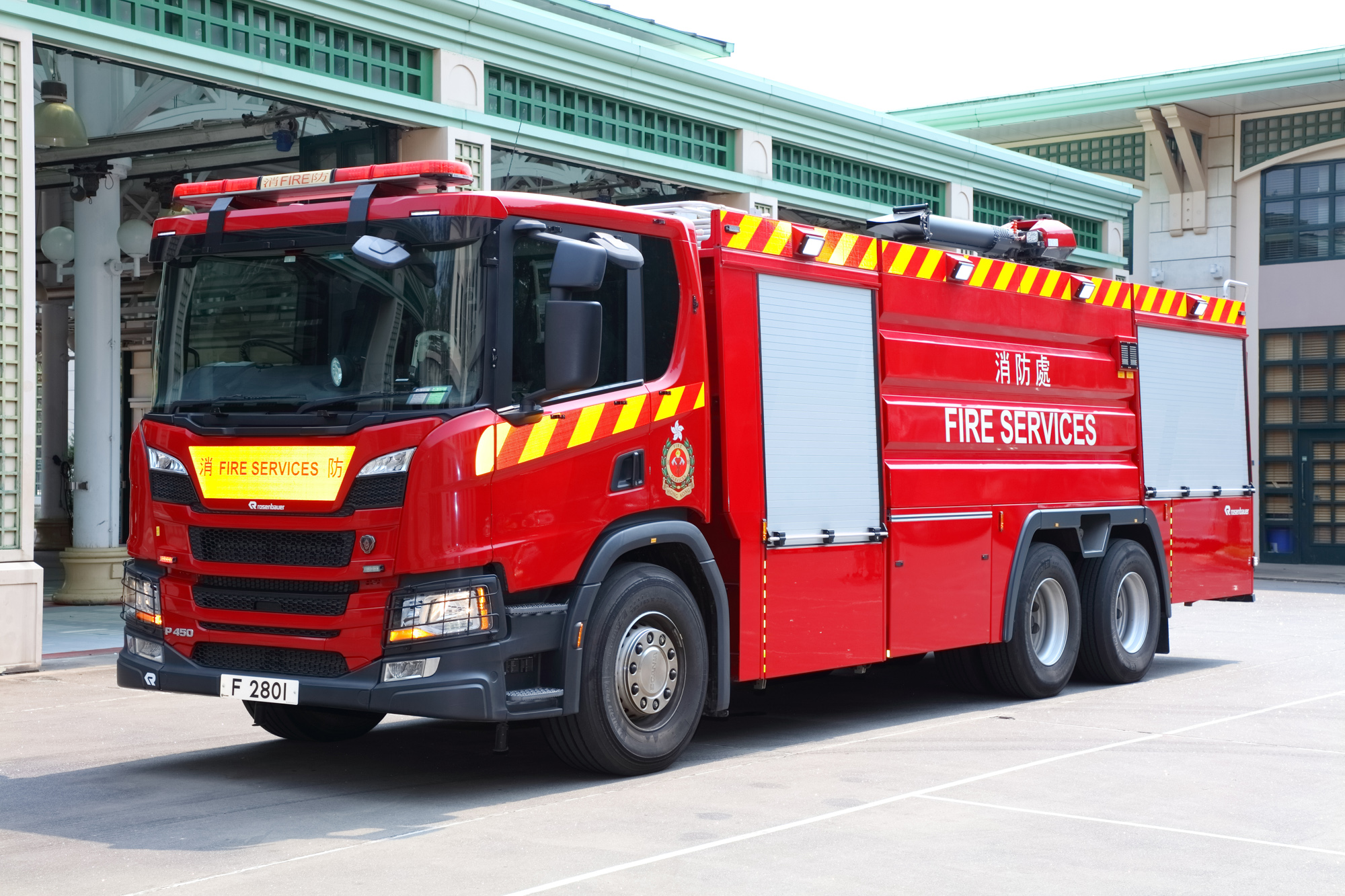 Bulk Foam Tender is designed to provide a continuous supply of foam concentrate to the First Intervention Vehicle for prolonged fire fighting operation with foam. Apart from equipping with a foam tank of a total capacity of 10,000 litres, the fire appliance has a roof mounted foam monitor, a water pump of 6,000 litres/min. and a foam concentrate transfer pump of 500 litres/min. |